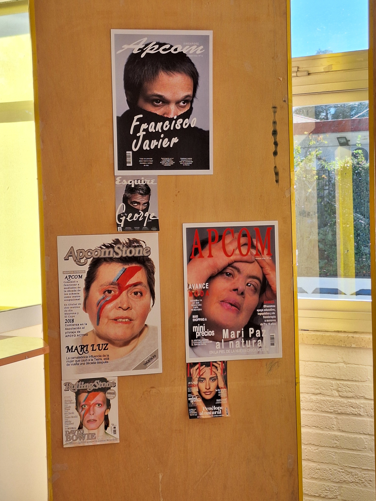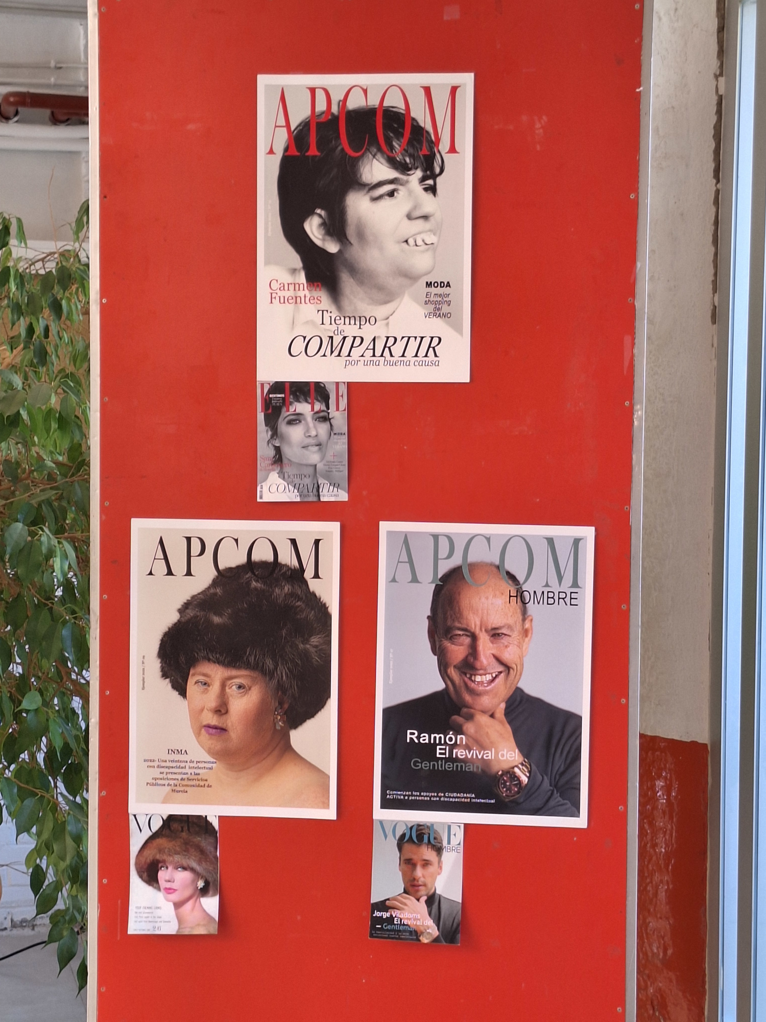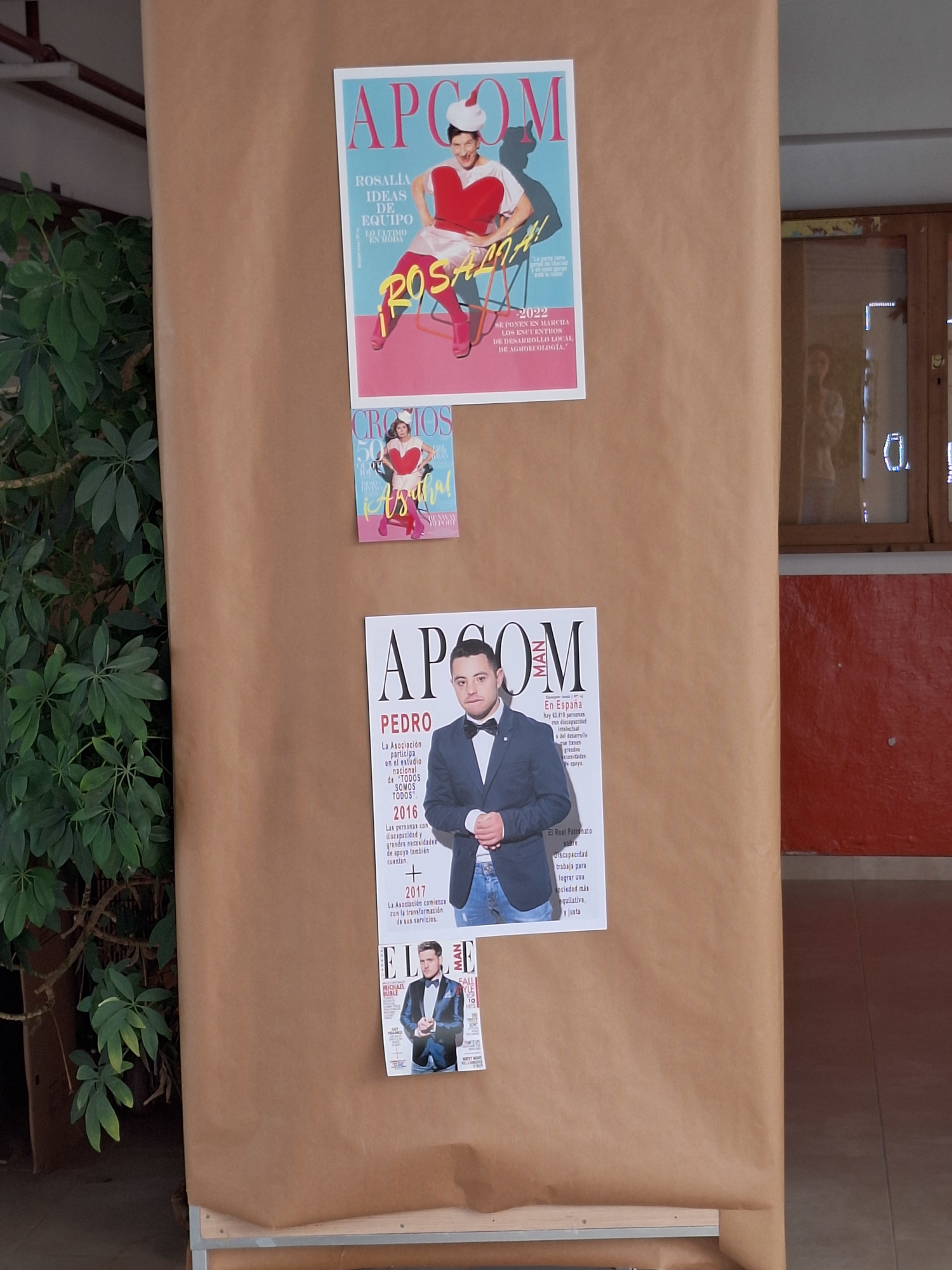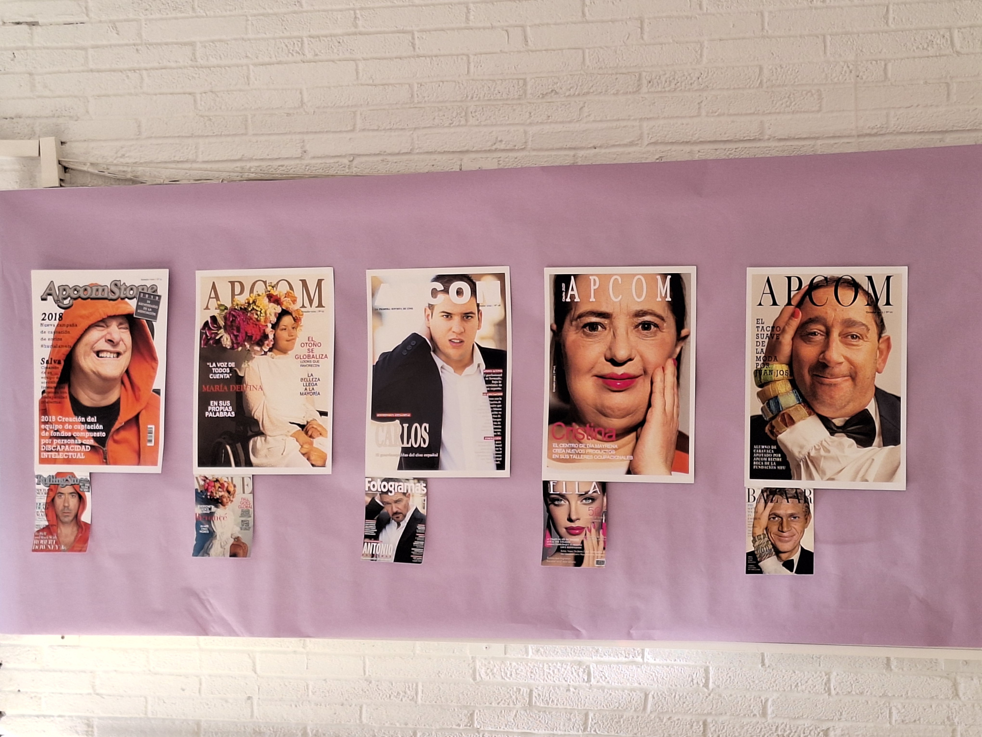 Exposición de fotografías en el hall del centro organizada por APCOM, en las que los usuarios de la asociación recrean, de manera creativa, portadas de revistas famosas, mostrando así su talento y su capacidad de superación