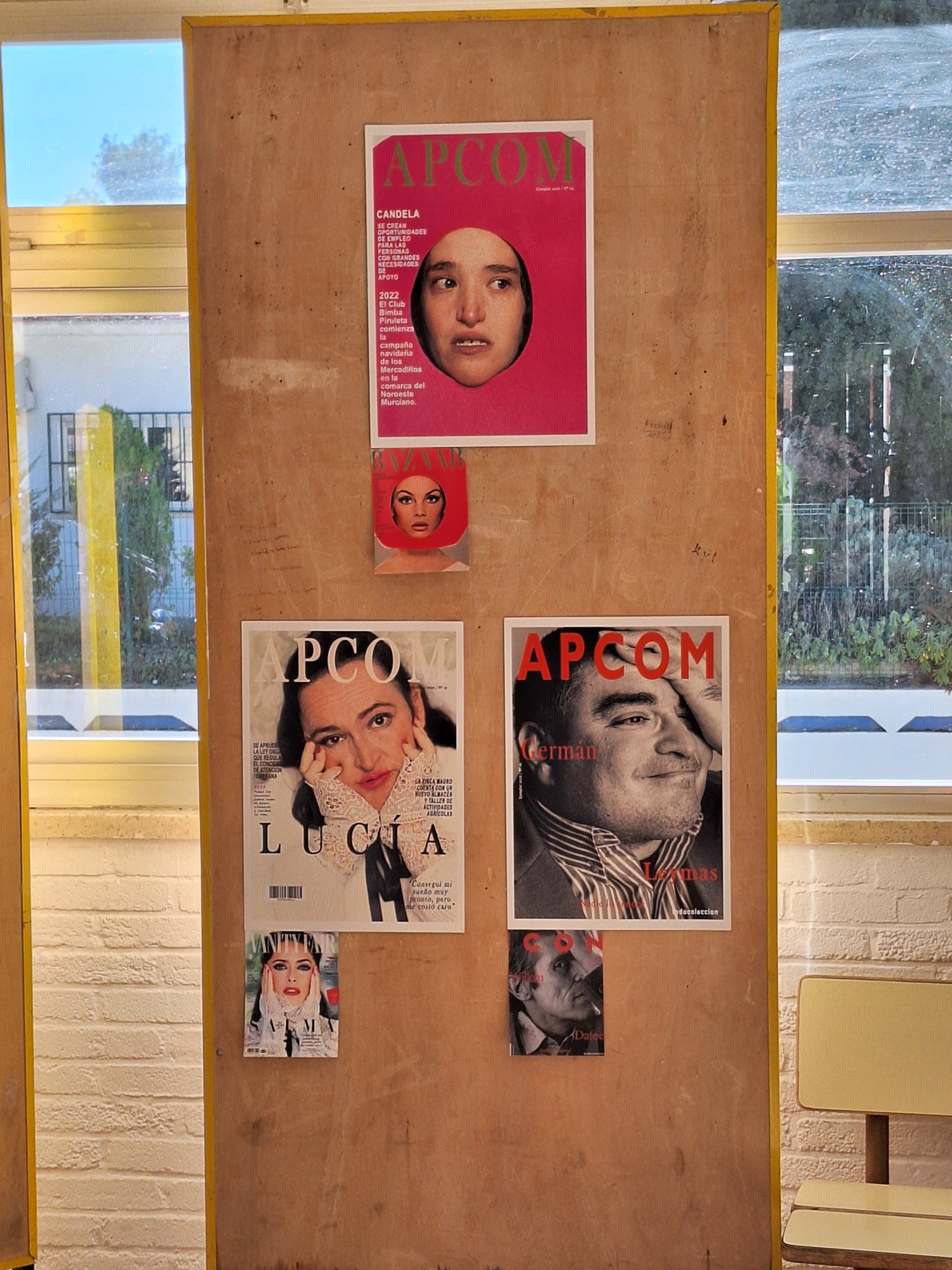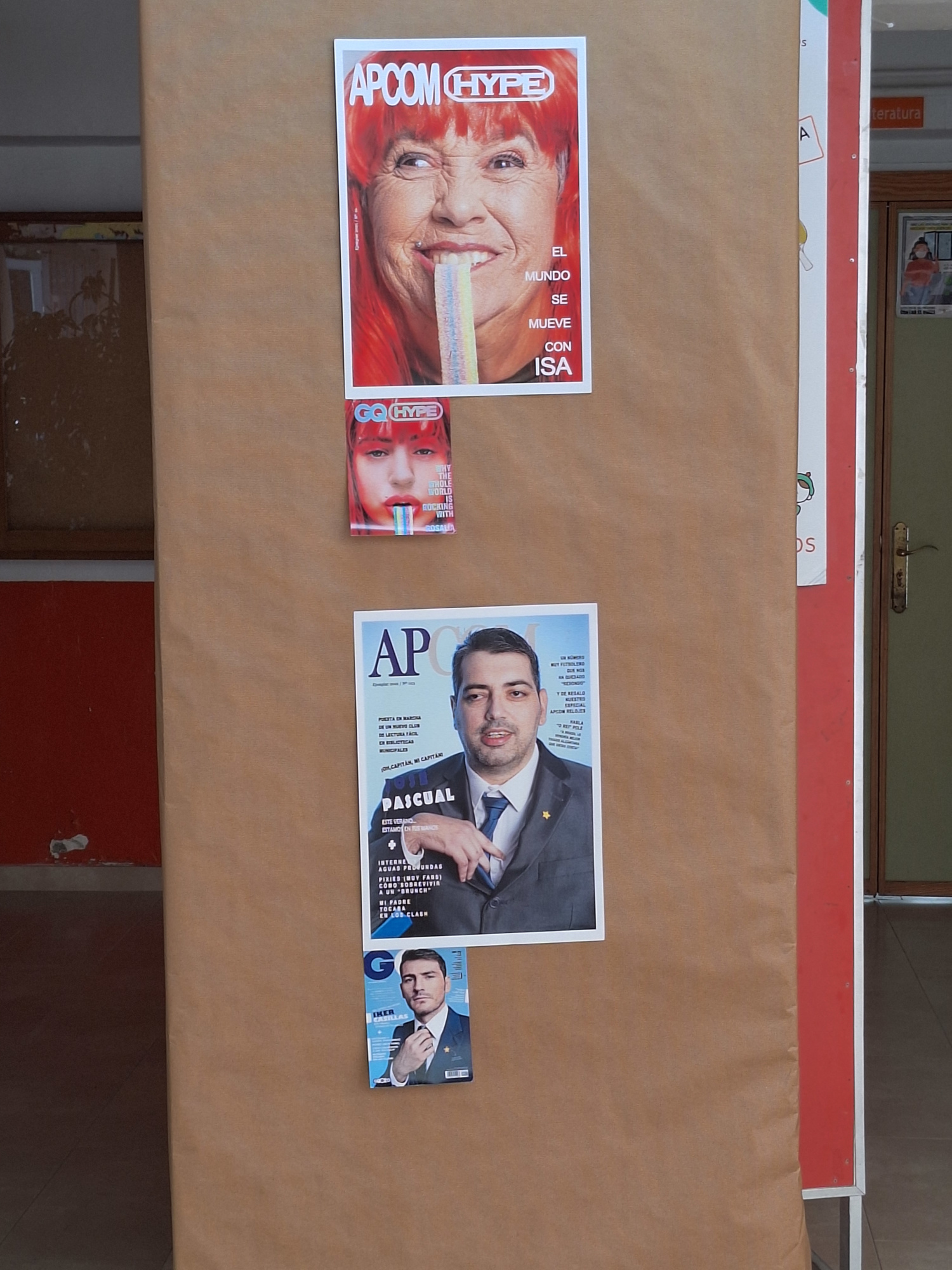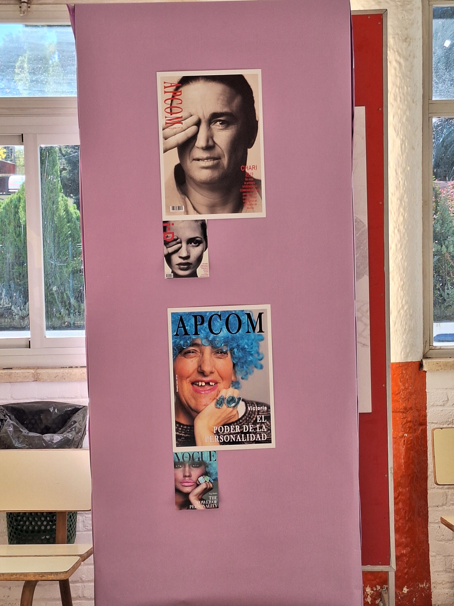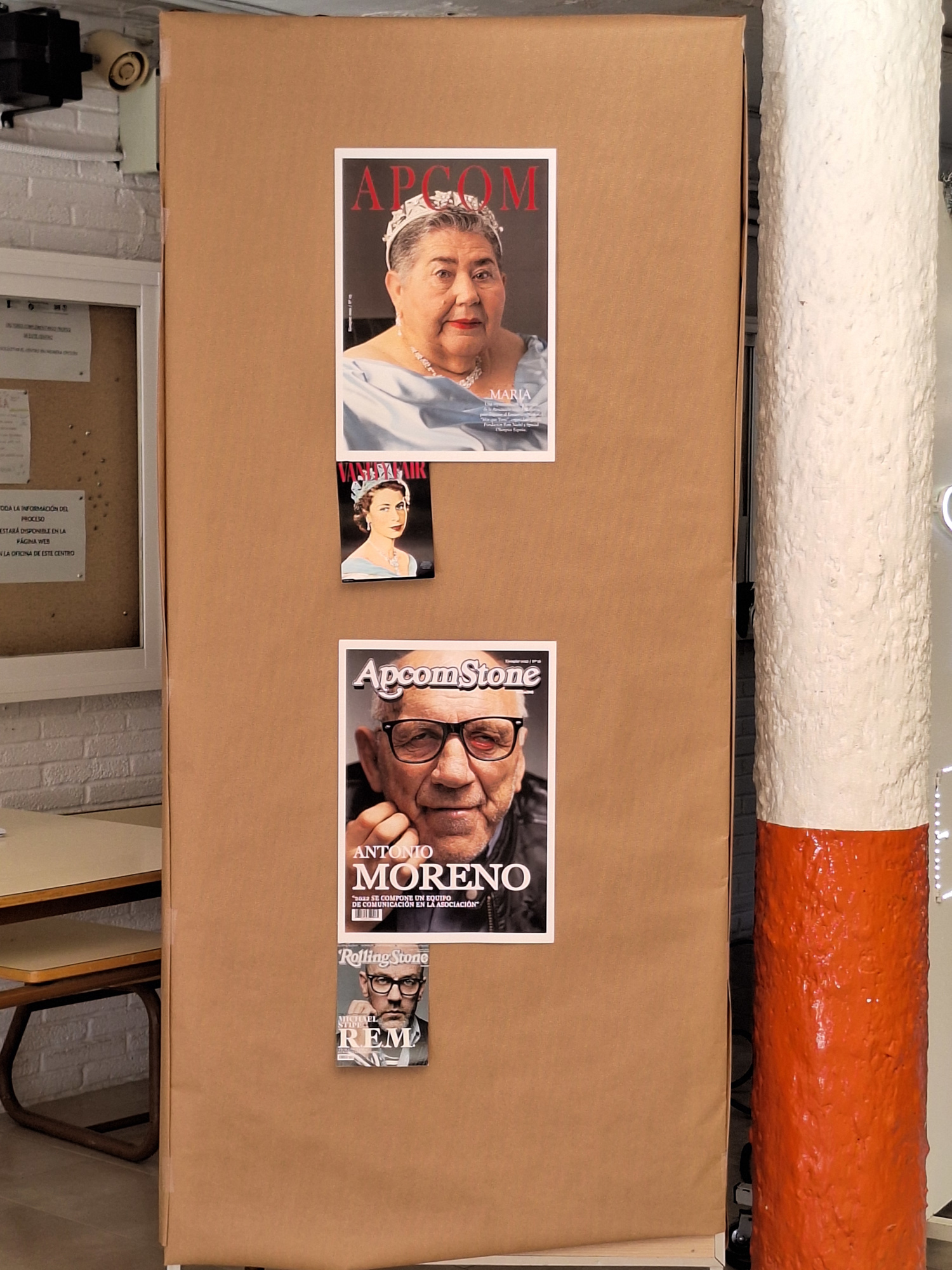 Exposición de fotografías en el hall del centro organizada por APCOM, en las que los usuarios de la asociación recrean, de manera creativa, portadas de revistas famosas, mostrando así su talento y su capacidad de superación